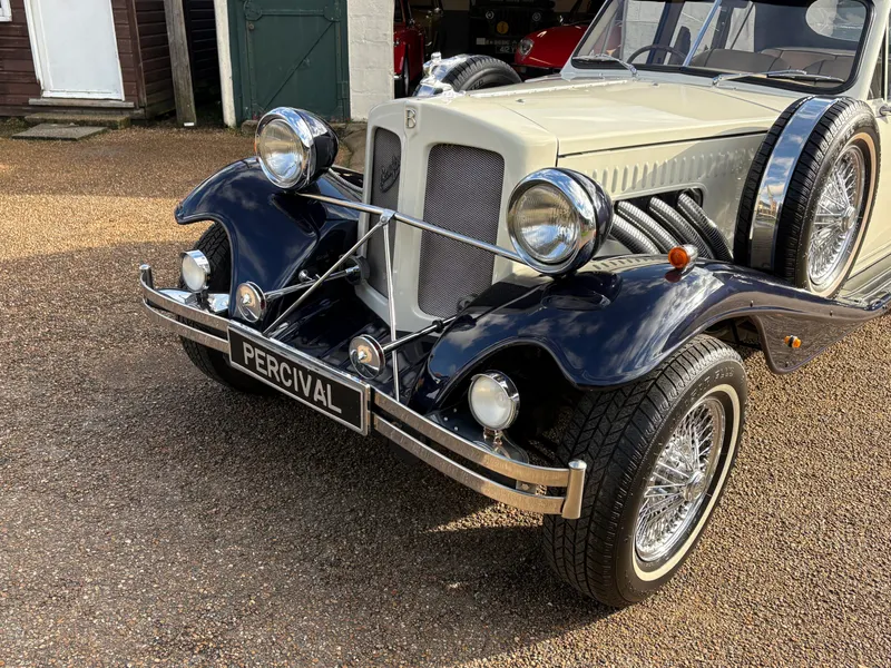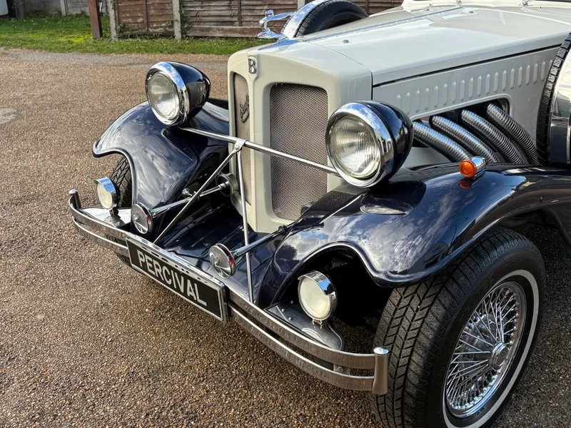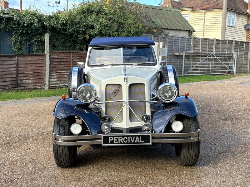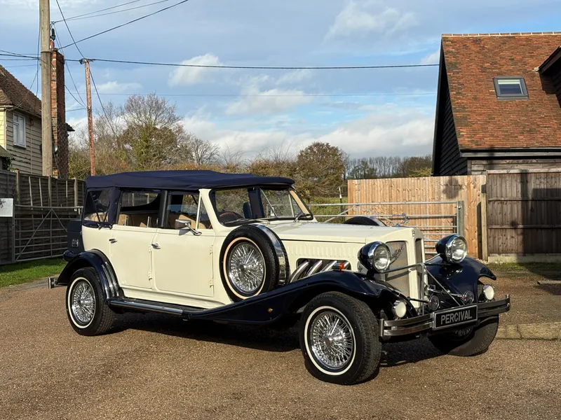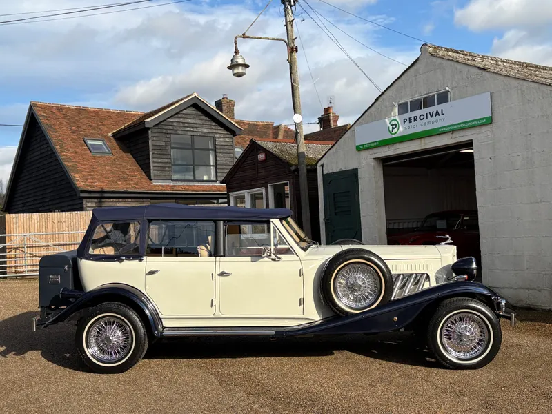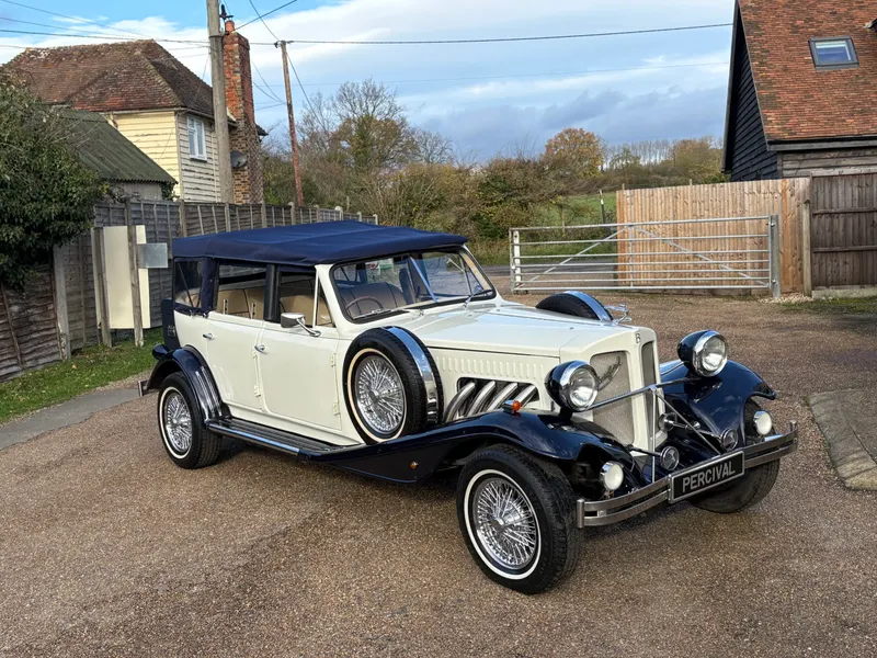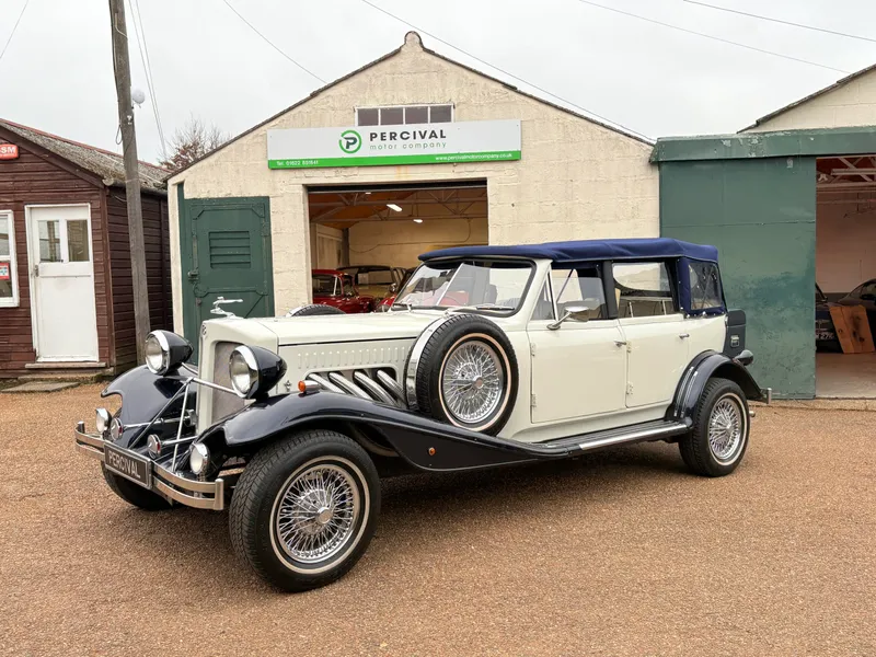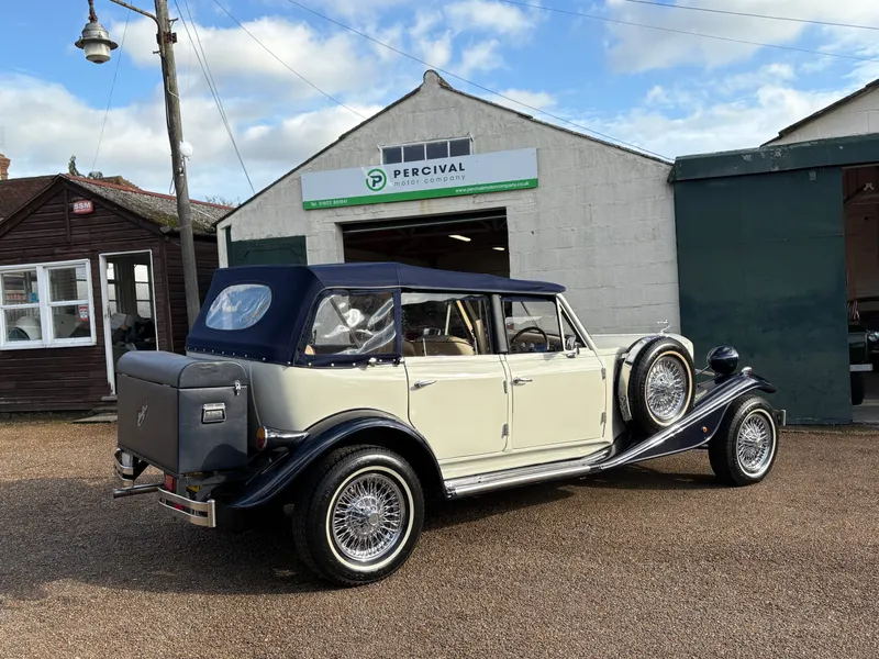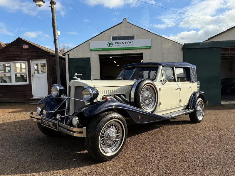 In cream and metallic blue with a blue pinstripe, and a cream interior with blue piping. This is a Long Bodied, 4 door Beauford which has been used by a local wedding car business and is presented in excellent condition. The joy of this car is that there is plenty of room in the back and that the rear doors give very good access. The car was in great demand and did very well for the last owner, creating regular income and quickly recovering their initial outlay. A change of plans means that it is now up for sale. It is very striking with its '30s appearance and lots of chrome. The blue and cream colour scheme really lifts the Beauford over others, and the blue mohair hood contrasts nicely. The car was ordered with lots of extras including six proper chrome wheels with whitewall tyres, chrome spotlights, chrome extended horns, Kenwood music, a split screen, a luggage trunk in blue with a Beauford emblem and a wood veneer dash. Manufactured in 2009, the Beauford has a Sierra engine and gearbox and is therefore easy to drive and maintain. The history file includes the original brochures and order form, invoices and notes about the build, MOTs and maintenance bills. It has recently been serviced and the MOT runs to September 2026. It has only covered 18,000 miles since build. The car is properly registered as a Beauford. The paintwork is excellent with a deep, smooth finish and the interior is virtually unmarked. The hood fits properly and shows no sign of of wear. Overall, the Beauford looks the part and is ready to be enjoyed as something a little different or to be used to provide an income for weddings and social events. Or both! The car will come with its original registration number F638 YEF. Percival Motor Company can recommend transport companies and finance providers.