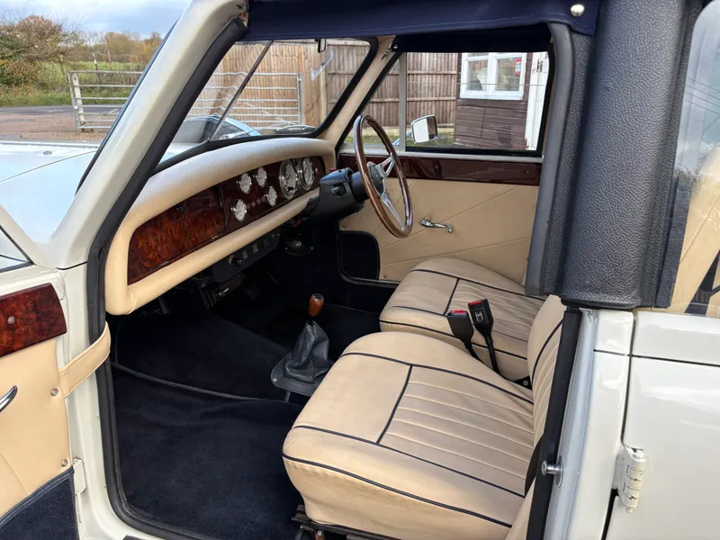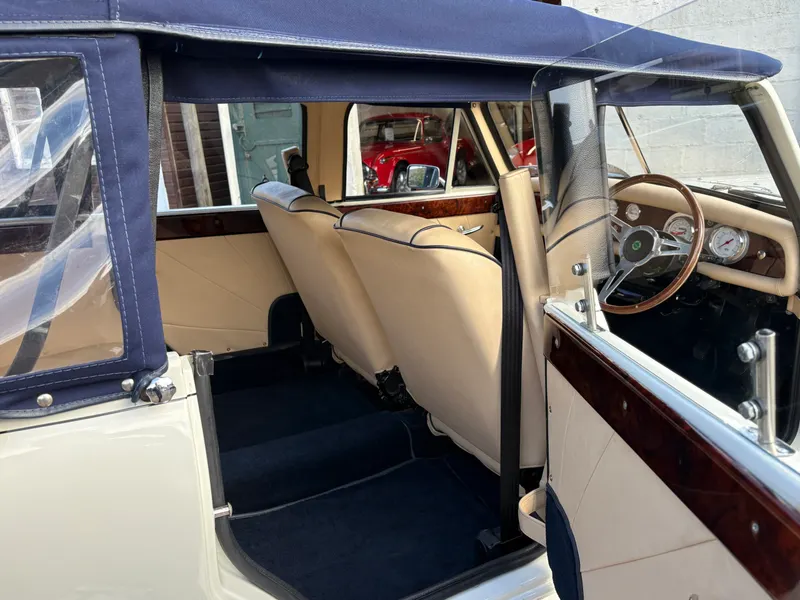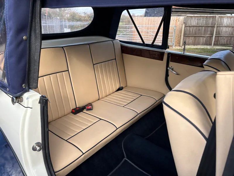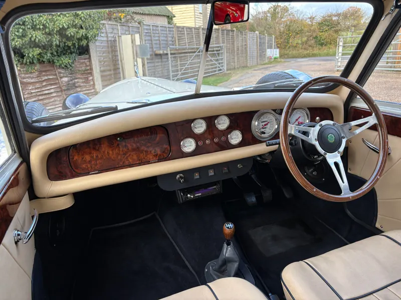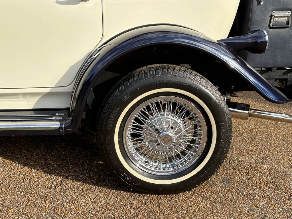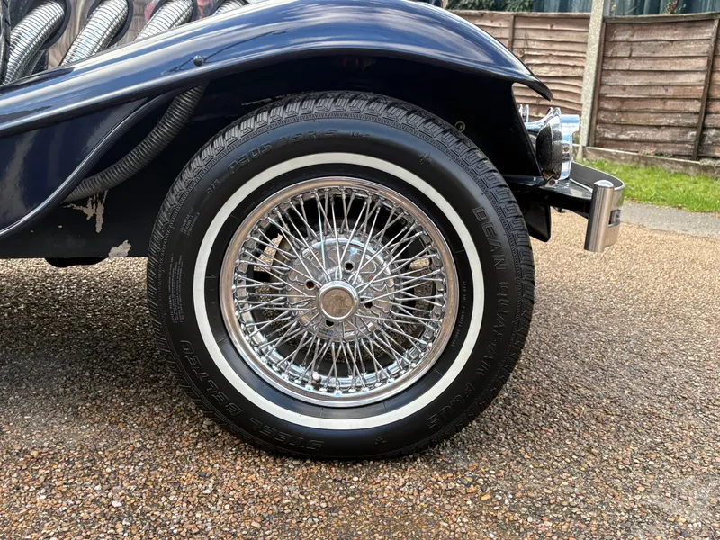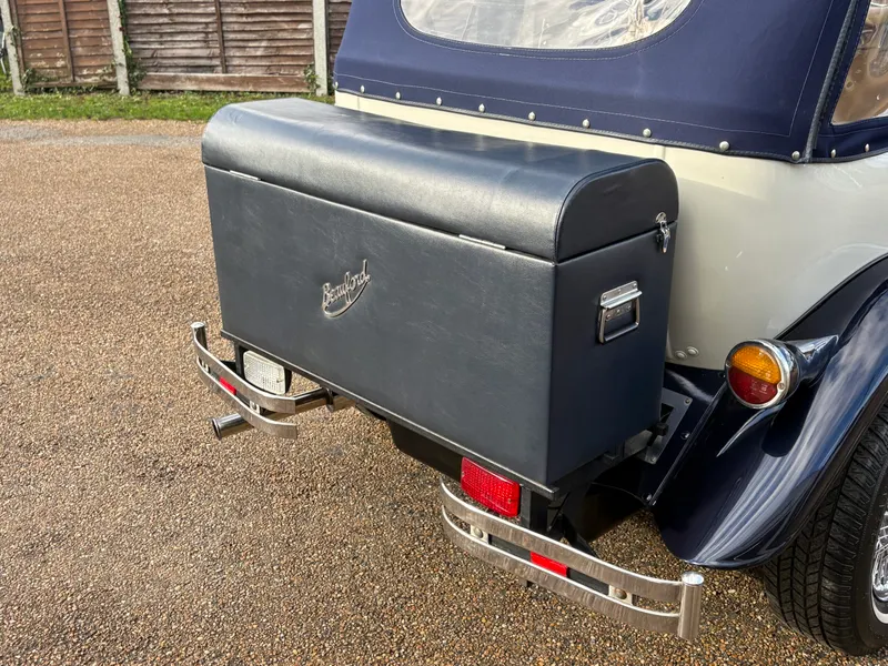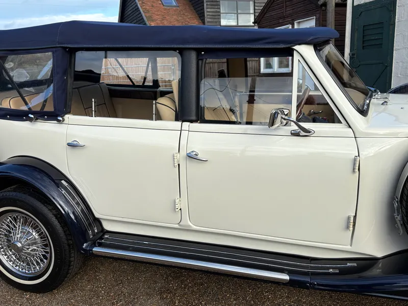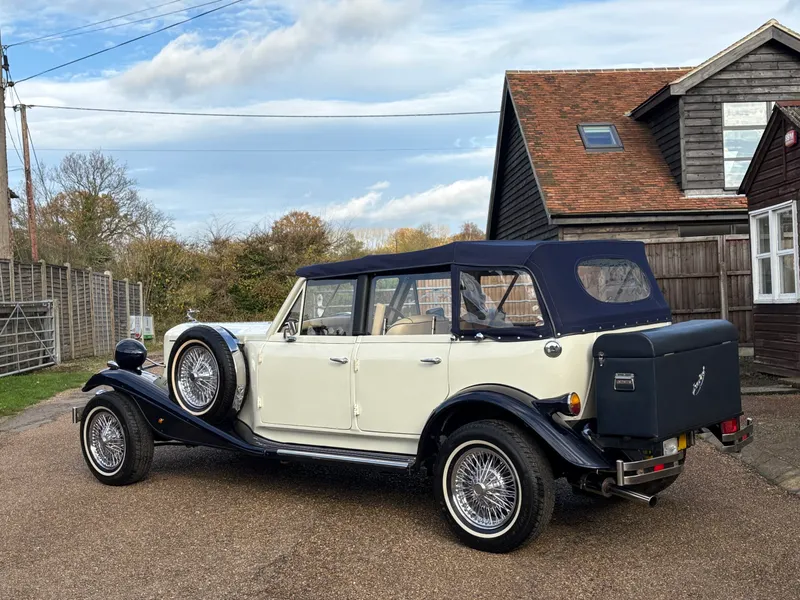 In cream and metallic blue with a blue pinstripe, and a cream interior with blue piping. This is a Long Bodied, 4 door Beauford which has been used by a local wedding car business and is presented in excellent condition. The joy of this car is that there is plenty of room in the back and that the rear doors give very good access. The car was in great demand and did very well for the last owner, creating regular income and quickly recovering their initial outlay. A change of plans means that it is now up for sale. It is very striking with its '30s appearance and lots of chrome. The blue and cream colour scheme really lifts the Beauford over others, and the blue mohair hood contrasts nicely. The car was ordered with lots of extras including six proper chrome wheels with whitewall tyres, chrome spotlights, chrome extended horns, Kenwood music, a split screen, a luggage trunk in blue with a Beauford emblem and a wood veneer dash. Manufactured in 2009, the Beauford has a Sierra engine and gearbox and is therefore easy to drive and maintain. The history file includes the original brochures and order form, invoices and notes about the build, MOTs and maintenance bills. It has recently been serviced and the MOT runs to September 2026. It has only covered 18,000 miles since build. The car is properly registered as a Beauford. The paintwork is excellent with a deep, smooth finish and the interior is virtually unmarked. The hood fits properly and shows no sign of of wear. Overall, the Beauford looks the part and is ready to be enjoyed as something a little different or to be used to provide an income for weddings and social events. Or both! The car will come with its original registration number F638 YEF. Percival Motor Company can recommend transport companies and finance providers.