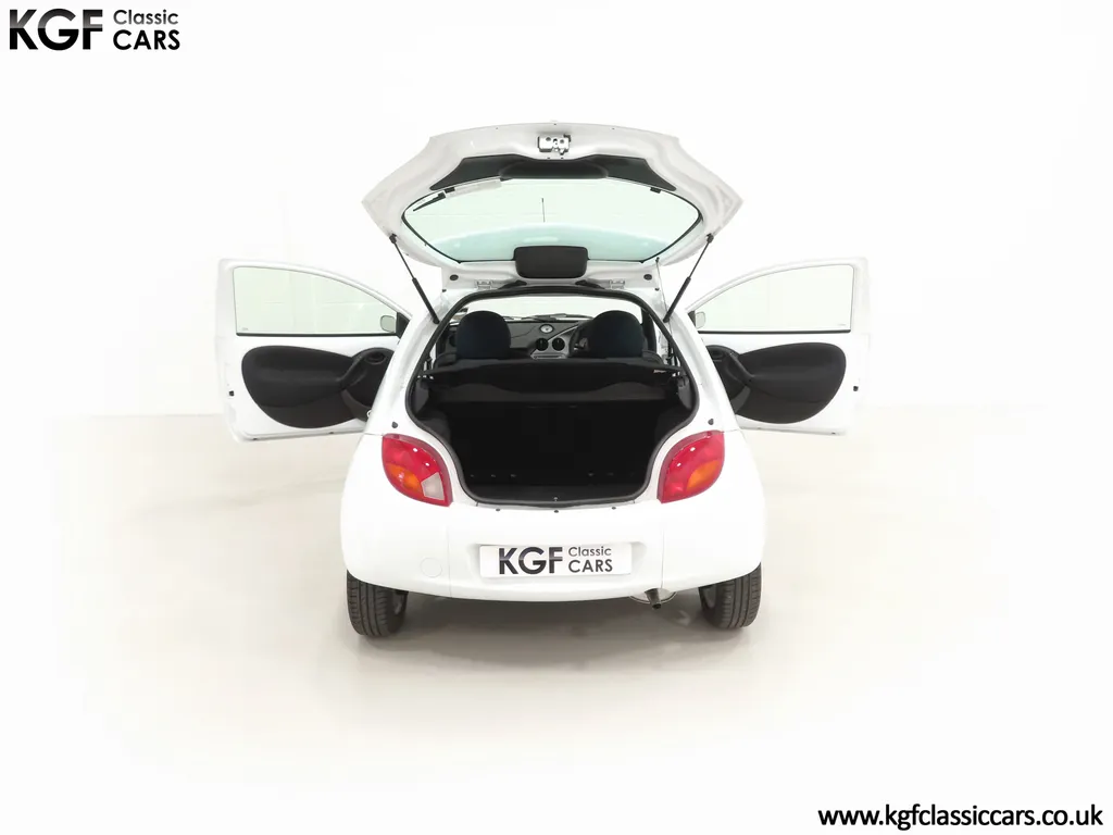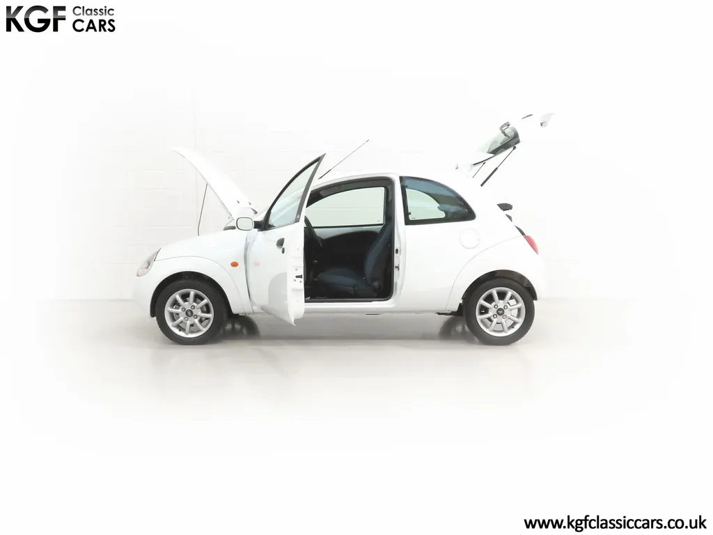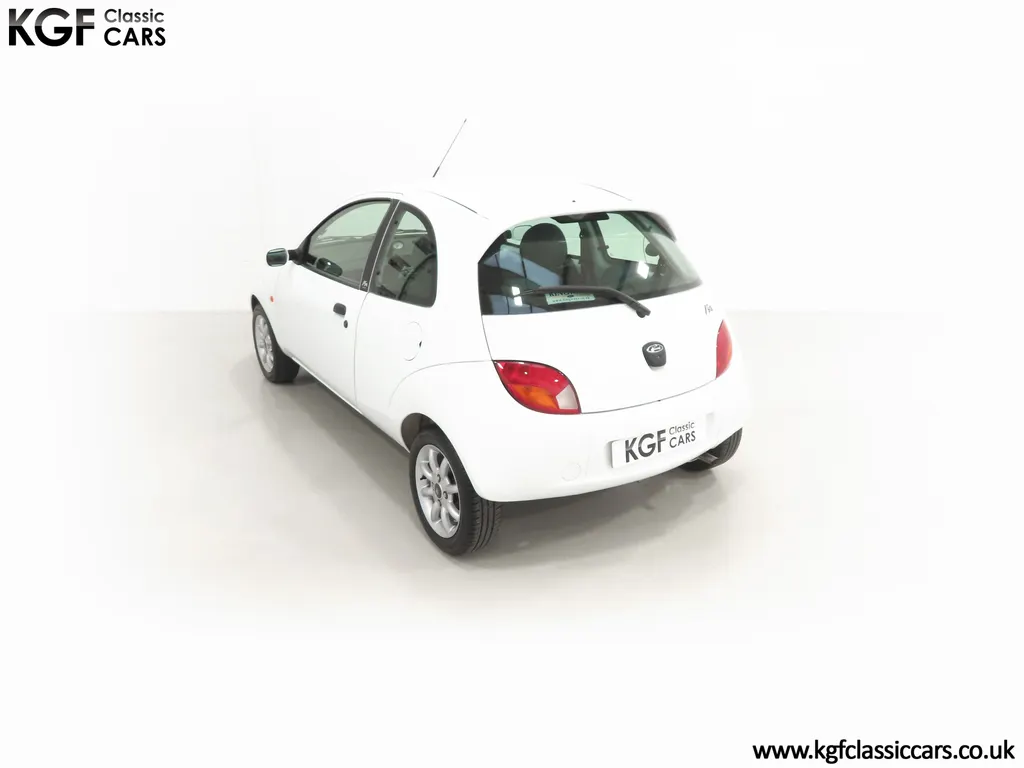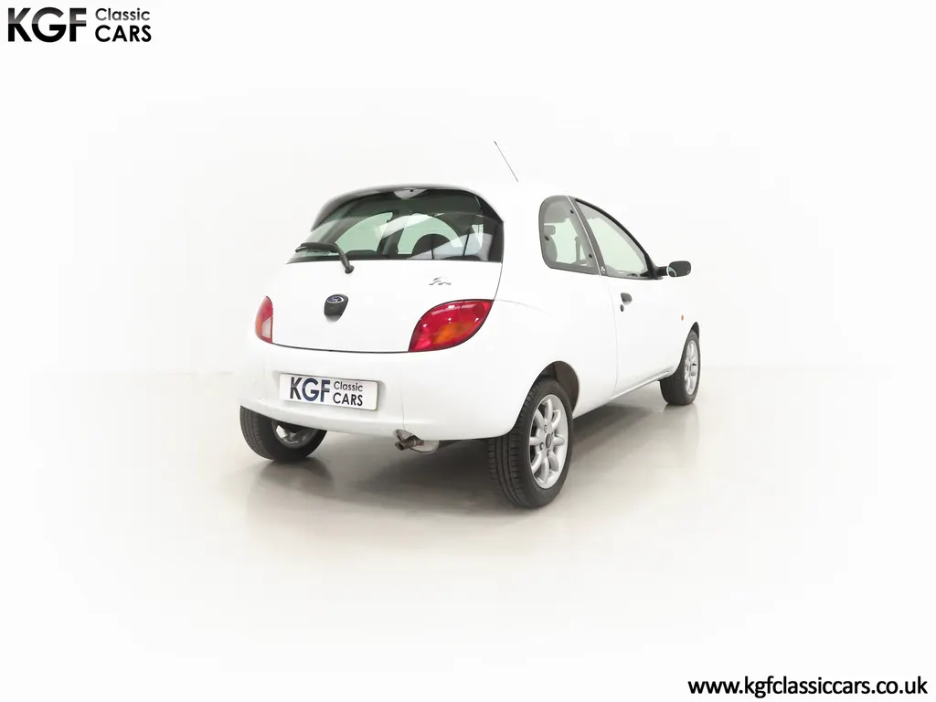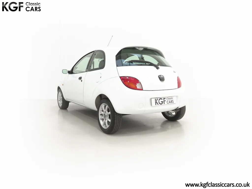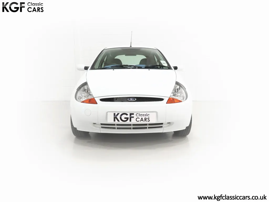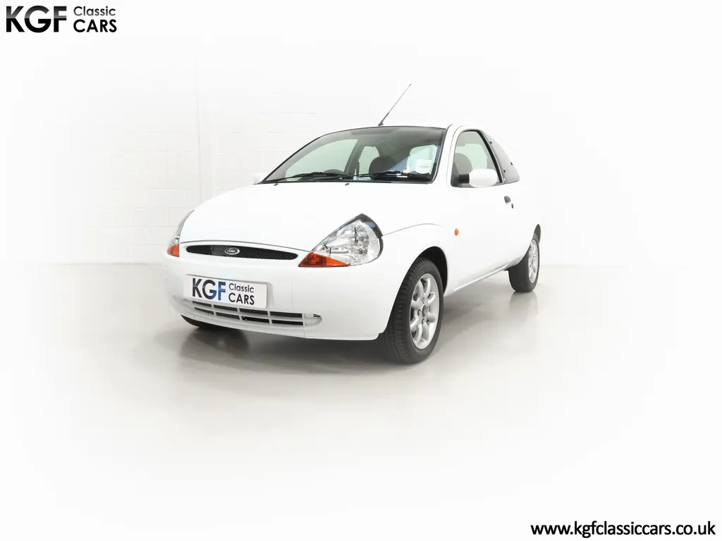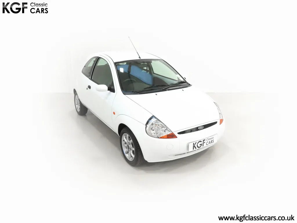 FOR SALE A zippy Ford Ka Zetec Climate with only 9,854 miles and one owner from new. EQUIPMENT Large body coloured bumpers, roof spoiler, colour coded door mirrors electrically operated and heated, Quickclear heated front screen, heated rear window, halogen headlights, driver’s airbag, steel safety cage, front and rear energy absorbing crumple zones, side-impact door beams, Passive Anti-Theft System with immobiliser, remote central locking, electric front windows, air conditioning, analogue clock, 50:50 split back seats, door cup holders, rear cup holders, headlining storage net, glovebox, Stereo radio/CD Model 6000. Dealer Options: Ford Luxury Floor mats. EXTERIOR Ford Motor Company’s ‘New Edge’ design language began with the original Ka as the first production Ford to adopt the radical exterior styling mostly recognised with its use of intersecting arcs and crisp lines. This exceptional Ka has covered just 9,854 miles from new with only one owner. Finished in factory original Frozen White, (Code F7), the bodywork and paint finish are simply outstanding with a bright pure shine to the pin-straight panels. A small touched in scuff to the nearside door mirror is the only imperfection worthy of mention. This garaged Ka has none of the common bodywork issues often found and the amazing underside still displays factory labels, long lost on most examples. Ford Supplying dealer number plates, rear screen sticker and tax disc holder remain fitted. INTERIOR The interior of this ultra-low mileage example is beautifully clean and free from wear. The original Tic Toc fabric upholstery in Aquarius Blue colour scheme, (Code AT), is spotless with no wear or damage to the fabric whatsoever. The carpets are pristine having been protected from new by Ford Luxury floor mats and the headlining is perfect. The steering wheel and gear knob display a total lack of wear synonymous with the ultra-low mileage. The funky blob style fascia and incorporated switchgear is as new, and all functions operate seamlessly including the original Model 6000 stereo CD and ice-cold air conditioning. Likewise, the spotless load space boasts an unmarked carpet underneath with the boot floor is as new. Clean, fresh and totally unspoilt. ENGINE & TRANSMISSION The dependable and frugal 1.3 Duratec four-cylinder engine as fitted to all post 2002 non-sporting Ka’s produces a power output of 70bhp and 106Nm of torque to achieve a top speed of 104mph and 0-60 in 14.1 seconds. The engine is quiet and performs faultlessly and all fluids are clean. The pristine engine bay features all factory stickers, plates, PDI markings and even fragile paper labels fully intact to items such as the inner headlamps casings. The five-speed gearbox is light, precise and effortless to use with a perfectly comfortable motorway cruising manner. WHEELS, TYRES & BRAKES The original Zetec specification 14in 8-spoke Minilite alloy wheels remain in perfect condition, as do the Ford emblem centre caps. Matching Continental ContiEcoContact3 165/60 R14 tyres show masses of tread. The tyre fitted to the full-size spare wheel has never been used. Diagonally split dual line brakes with Anti-Lock assistance (ABS) bring the car up straight and steady with brand new discs fitted in November 2025. HISTORY FILE Registered new on 13th August 2007 by Ford Main Dealer, Ringways Motor Group in Doncaster, the car was purchased by a Miss Flavell who is the first and only owner. The car was purchased for use in retirement and as is common, the usage was regular albeit minimal, and it was kept in the garage when not in use. Only upon the owner’s passing in 2025 has the car become available and subsequently was offered to KGF Classic Cars. Recognising the first generation KA’s fast diminishing on our roads and the scarce availability of pristine low mileage cars, we are delighted to present this car ready for its second appreciate owner. A service, full inspection and MOT have been carried out in November 2025 and all maintenance is up to date. Both keys and handbook pack are present along with a paperwork file and original sales brochure for the 2007 model year Ka. In addition, a Ford Main Dealer service and maintenance log allows you to track the verified mileage before Miss Flavell’s local garage, Woodman Service Station Limited (that was incorporated in 1965 and now closed in 2024), maintained the car. Debate over the pronunciation of the name Ka has continued since launch and whether it is to be said with a long or short "a", or with the letters pronounced separately. Even Ford's confused press office has used all three, but the official Ford stance is with a short “a”! Whichever way you may wish to say it, the first examples are now approaching 30 years old and the humble Ford Ka represents a superb value entry into classic car ownership, even more so with this incredible one-owner example with just 9,854 miles from new! MOT November 2026, HPI Clear.
