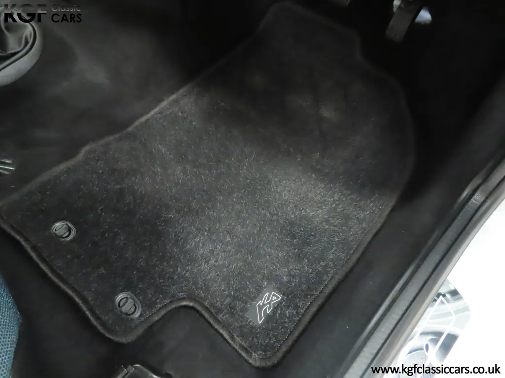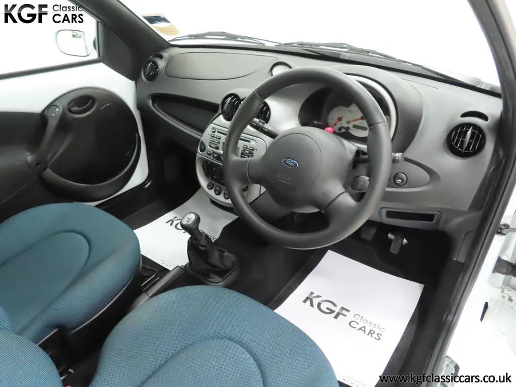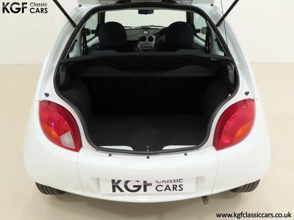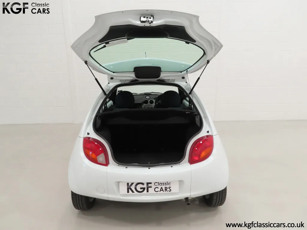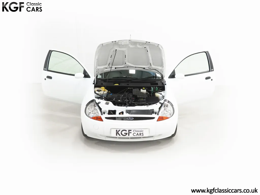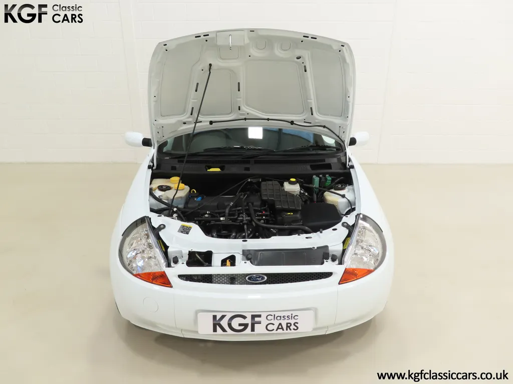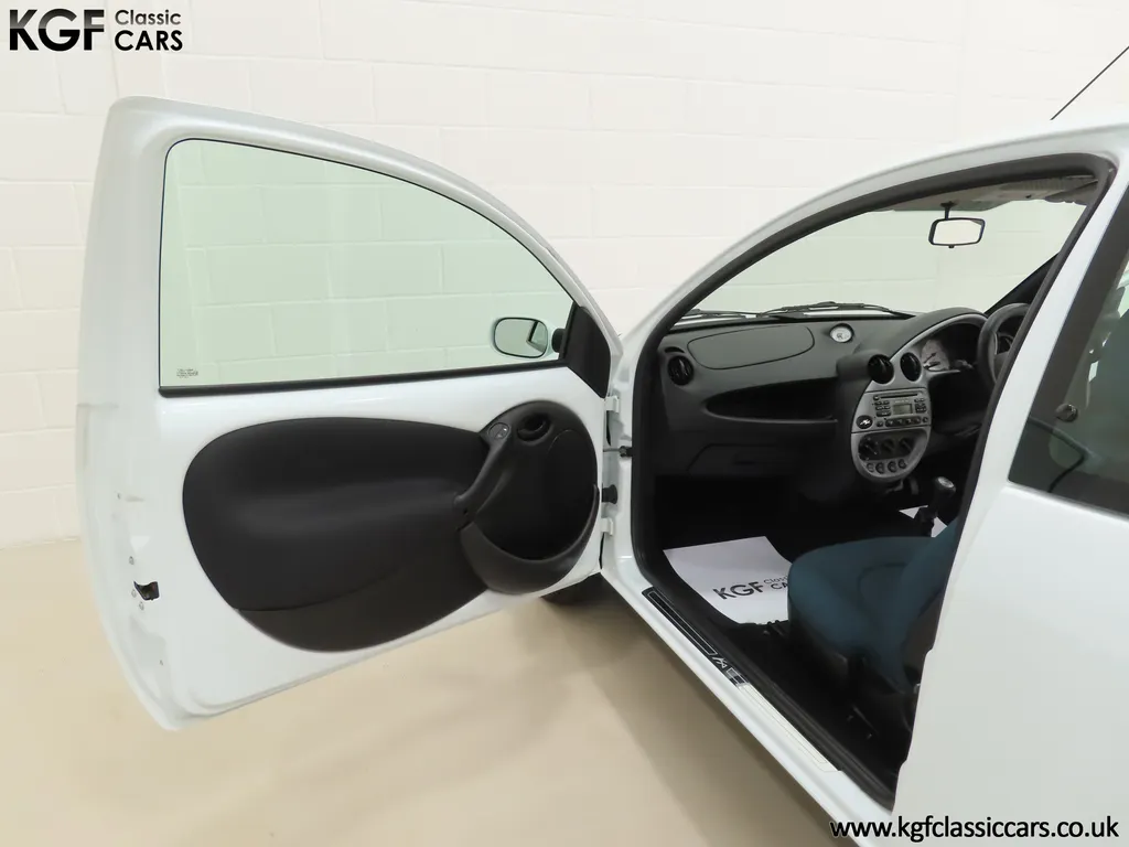 FOR SALE A zippy Ford Ka Zetec Climate with only 9,854 miles and one owner from new. EQUIPMENT Large body coloured bumpers, roof spoiler, colour coded door mirrors electrically operated and heated, Quickclear heated front screen, heated rear window, halogen headlights, driver’s airbag, steel safety cage, front and rear energy absorbing crumple zones, side-impact door beams, Passive Anti-Theft System with immobiliser, remote central locking, electric front windows, air conditioning, analogue clock, 50:50 split back seats, door cup holders, rear cup holders, headlining storage net, glovebox, Stereo radio/CD Model 6000. Dealer Options: Ford Luxury Floor mats. EXTERIOR Ford Motor Company’s ‘New Edge’ design language began with the original Ka as the first production Ford to adopt the radical exterior styling mostly recognised with its use of intersecting arcs and crisp lines. This exceptional Ka has covered just 9,854 miles from new with only one owner. Finished in factory original Frozen White, (Code F7), the bodywork and paint finish are simply outstanding with a bright pure shine to the pin-straight panels. A small touched in scuff to the nearside door mirror is the only imperfection worthy of mention. This garaged Ka has none of the common bodywork issues often found and the amazing underside still displays factory labels, long lost on most examples. Ford Supplying dealer number plates, rear screen sticker and tax disc holder remain fitted. INTERIOR The interior of this ultra-low mileage example is beautifully clean and free from wear. The original Tic Toc fabric upholstery in Aquarius Blue colour scheme, (Code AT), is spotless with no wear or damage to the fabric whatsoever. The carpets are pristine having been protected from new by Ford Luxury floor mats and the headlining is perfect. The steering wheel and gear knob display a total lack of wear synonymous with the ultra-low mileage. The funky blob style fascia and incorporated switchgear is as new, and all functions operate seamlessly including the original Model 6000 stereo CD and ice-cold air conditioning. Likewise, the spotless load space boasts an unmarked carpet underneath with the boot floor is as new. Clean, fresh and totally unspoilt. ENGINE & TRANSMISSION The dependable and frugal 1.3 Duratec four-cylinder engine as fitted to all post 2002 non-sporting Ka’s produces a power output of 70bhp and 106Nm of torque to achieve a top speed of 104mph and 0-60 in 14.1 seconds. The engine is quiet and performs faultlessly and all fluids are clean. The pristine engine bay features all factory stickers, plates, PDI markings and even fragile paper labels fully intact to items such as the inner headlamps casings. The five-speed gearbox is light, precise and effortless to use with a perfectly comfortable motorway cruising manner. WHEELS, TYRES & BRAKES The original Zetec specification 14in 8-spoke Minilite alloy wheels remain in perfect condition, as do the Ford emblem centre caps. Matching Continental ContiEcoContact3 165/60 R14 tyres show masses of tread. The tyre fitted to the full-size spare wheel has never been used. Diagonally split dual line brakes with Anti-Lock assistance (ABS) bring the car up straight and steady with brand new discs fitted in November 2025. HISTORY FILE Registered new on 13th August 2007 by Ford Main Dealer, Ringways Motor Group in Doncaster, the car was purchased by a Miss Flavell who is the first and only owner. The car was purchased for use in retirement and as is common, the usage was regular albeit minimal, and it was kept in the garage when not in use. Only upon the owner’s passing in 2025 has the car become available and subsequently was offered to KGF Classic Cars. Recognising the first generation KA’s fast diminishing on our roads and the scarce availability of pristine low mileage cars, we are delighted to present this car ready for its second appreciate owner. A service, full inspection and MOT have been carried out in November 2025 and all maintenance is up to date. Both keys and handbook pack are present along with a paperwork file and original sales brochure for the 2007 model year Ka. In addition, a Ford Main Dealer service and maintenance log allows you to track the verified mileage before Miss Flavell’s local garage, Woodman Service Station Limited (that was incorporated in 1965 and now closed in 2024), maintained the car. Debate over the pronunciation of the name Ka has continued since launch and whether it is to be said with a long or short "a", or with the letters pronounced separately. Even Ford's confused press office has used all three, but the official Ford stance is with a short “a”! Whichever way you may wish to say it, the first examples are now approaching 30 years old and the humble Ford Ka represents a superb value entry into classic car ownership, even more so with this incredible one-owner example with just 9,854 miles from new! MOT November 2026, HPI Clear.