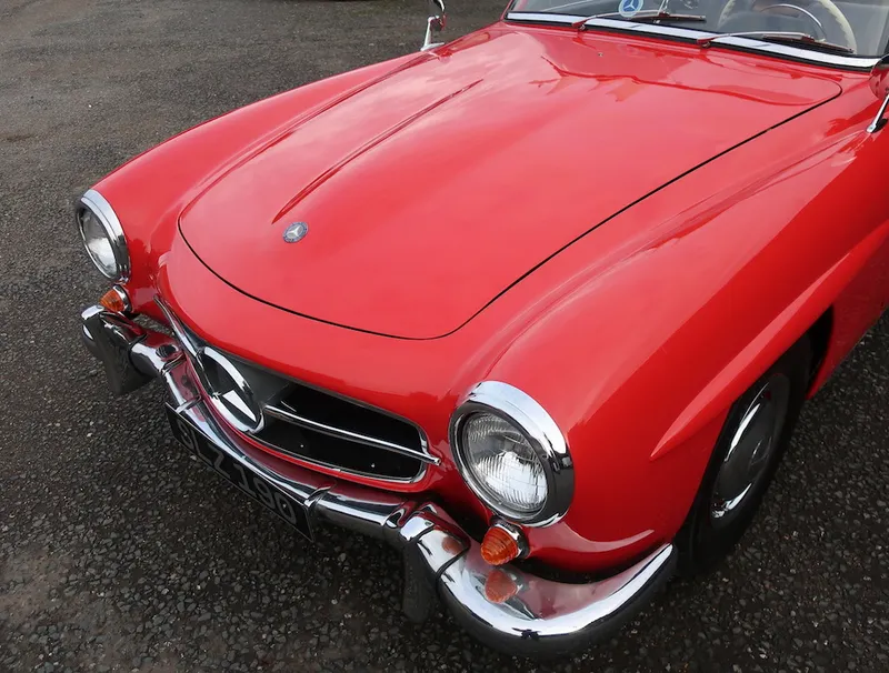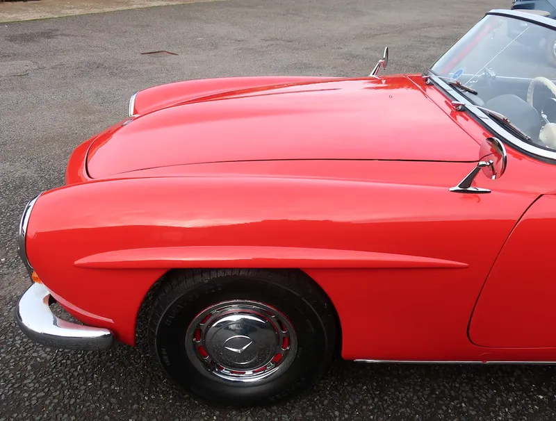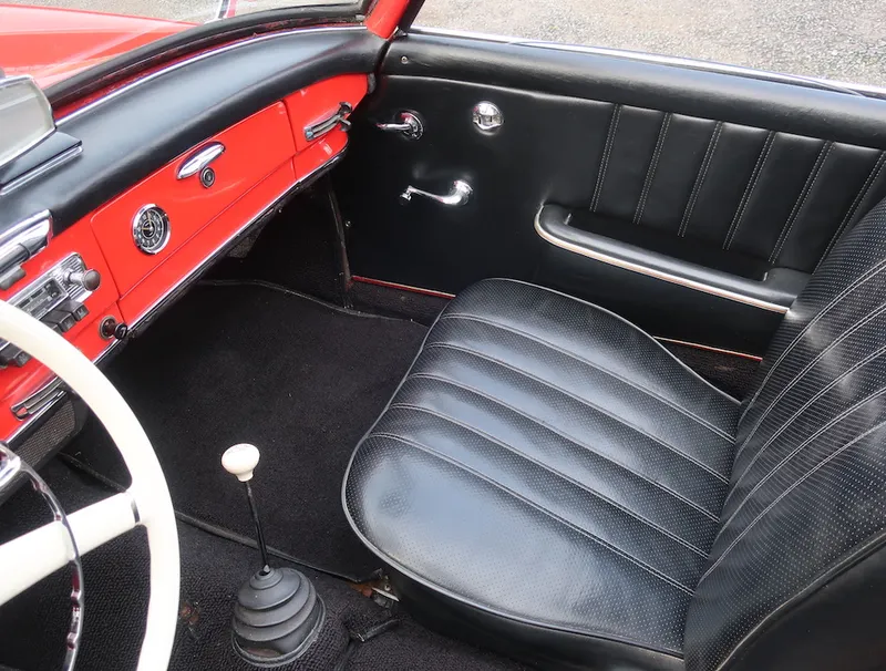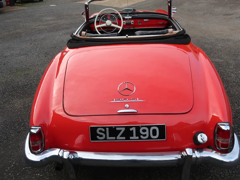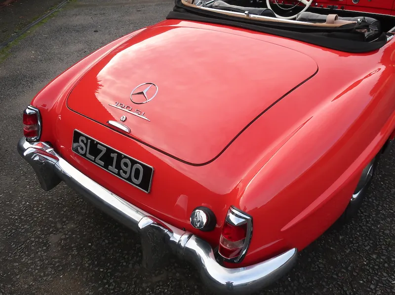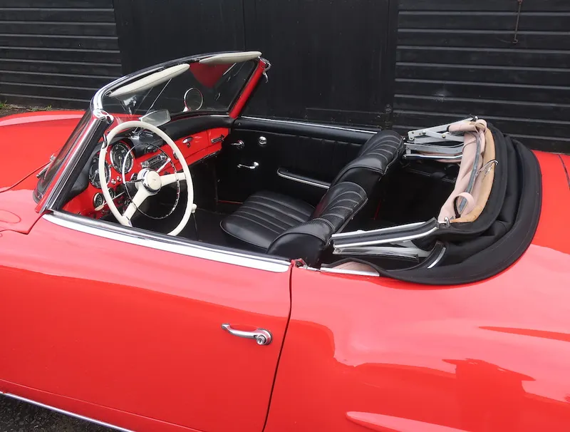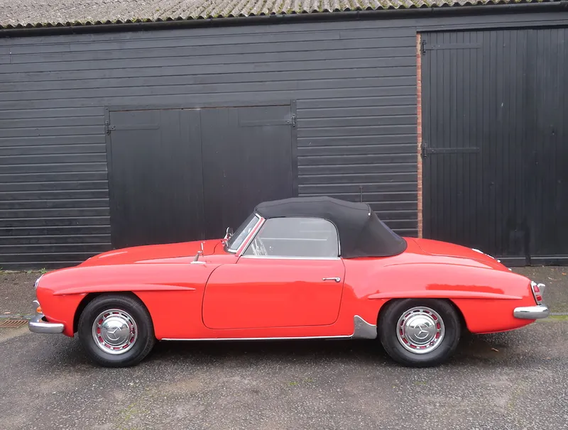 Coming from the last year of production this 190SL was delivered new in the USA before being shipped from Pensacola, Florida to its first UK owner in London in 1993. At the time of the UK registration in 1995 the milage was showing as 28,935. It is currently showing as 30,752. Photos in the history file show a previous body restoration while more recently the car has had much work totalling nearly £10,000 in 2022 which included work to the front suspension, fuel system, carb overhaul and full service. It was also fitted with a new black mohair soft top and the original solex carbs have been replaced with twin Webbers. In good running order the body appears solid but up close the paint has imperfections while the interior is largely original and a bit scruffy but at the current asking price there is plenty of room for improvement. It is supplied with a factory hard top and a spare set of wheels with brand new unused tyres as well as two workshop manuals. A good usable example at a very competitive price it has a small history file that contains some old MoT’s, a few invoices and previous owners correspondence.