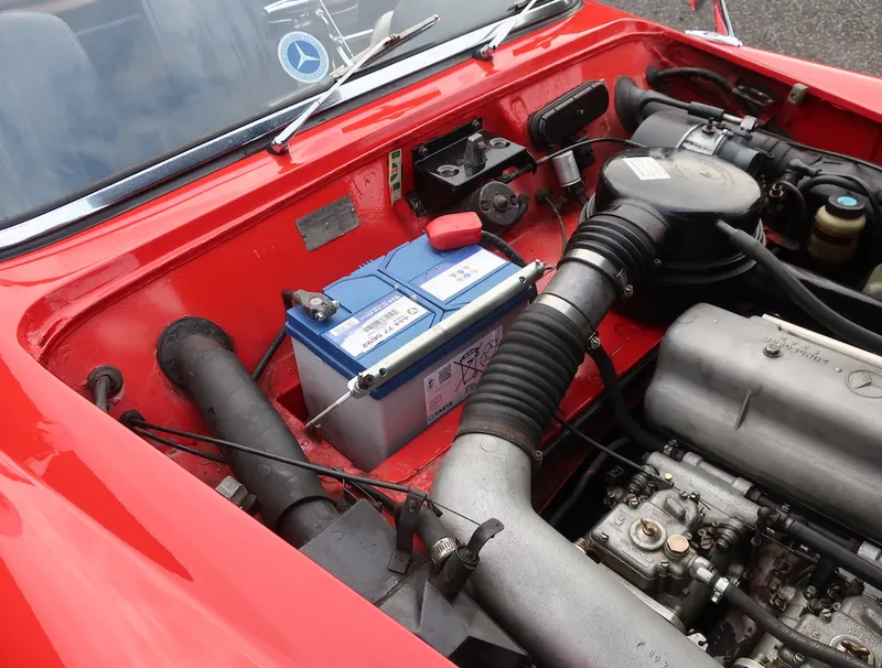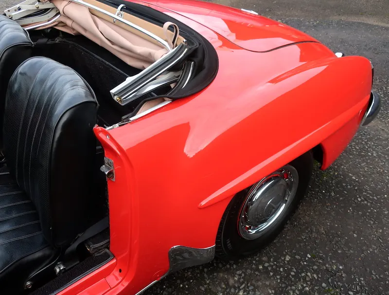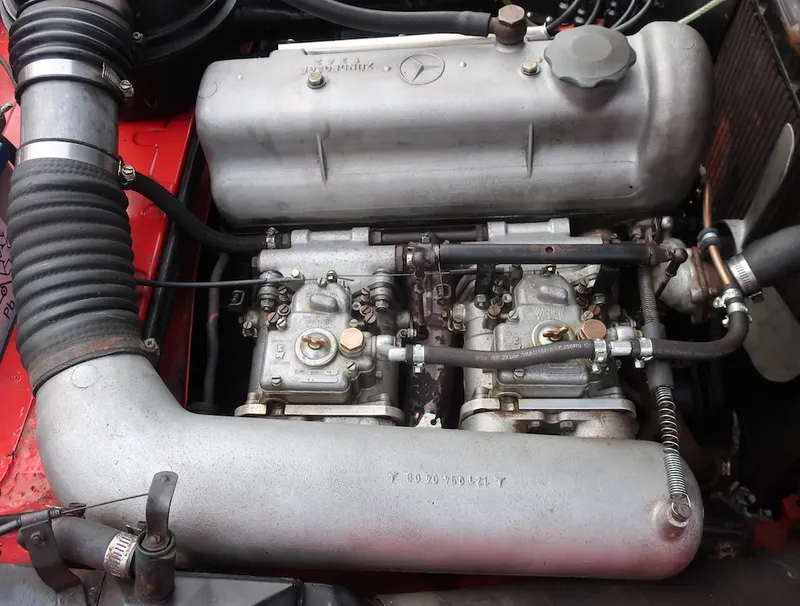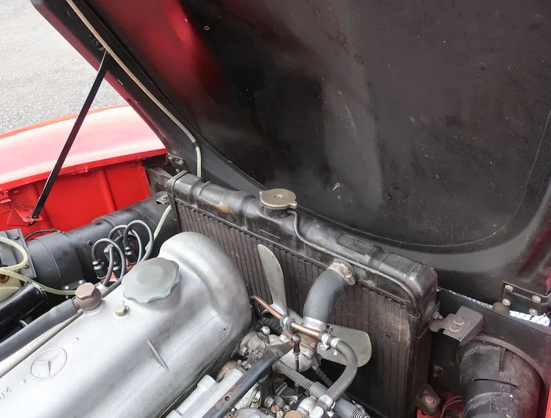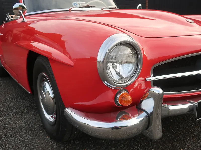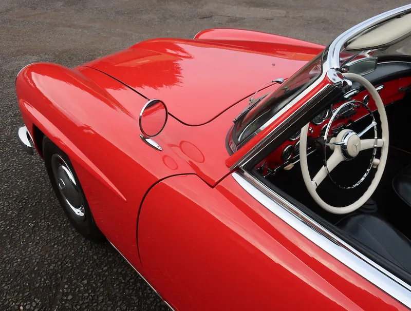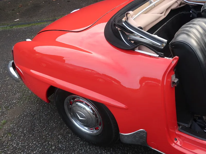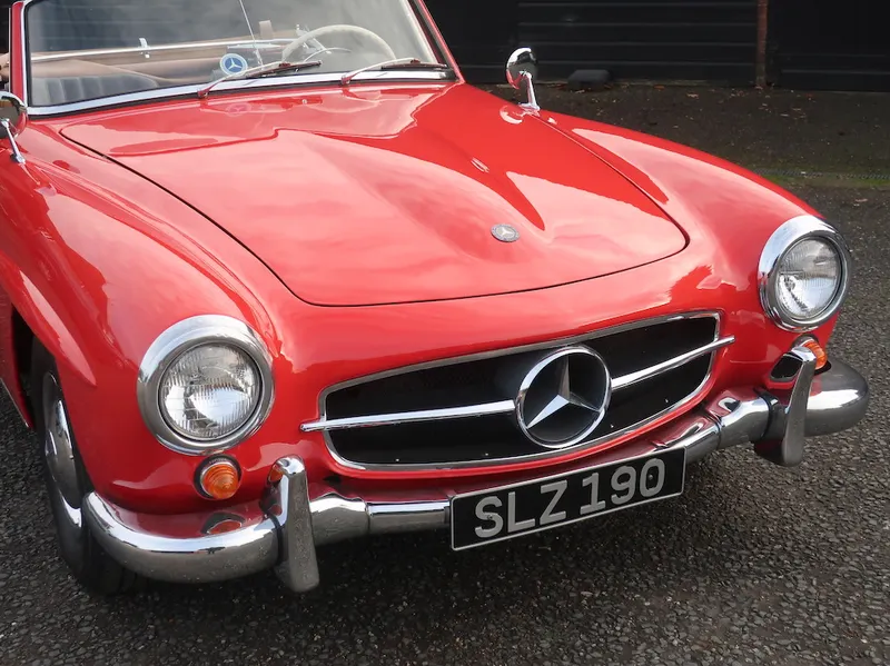 Coming from the last year of production this 190SL was delivered new in the USA before being shipped from Pensacola, Florida to its first UK owner in London in 1993. At the time of the UK registration in 1995 the milage was showing as 28,935. It is currently showing as 30,752. Photos in the history file show a previous body restoration while more recently the car has had much work totalling nearly £10,000 in 2022 which included work to the front suspension, fuel system, carb overhaul and full service. It was also fitted with a new black mohair soft top and the original solex carbs have been replaced with twin Webbers. In good running order the body appears solid but up close the paint has imperfections while the interior is largely original and a bit scruffy but at the current asking price there is plenty of room for improvement. It is supplied with a factory hard top and a spare set of wheels with brand new unused tyres as well as two workshop manuals. A good usable example at a very competitive price it has a small history file that contains some old MoT’s, a few invoices and previous owners correspondence.