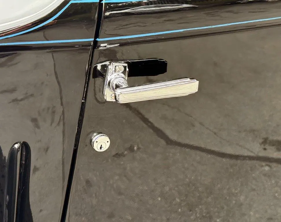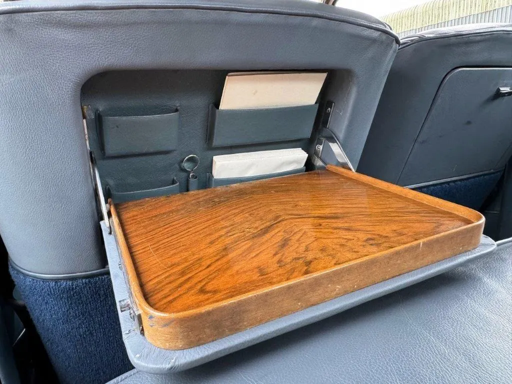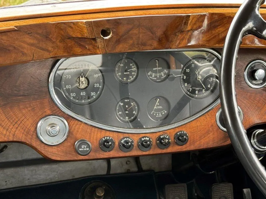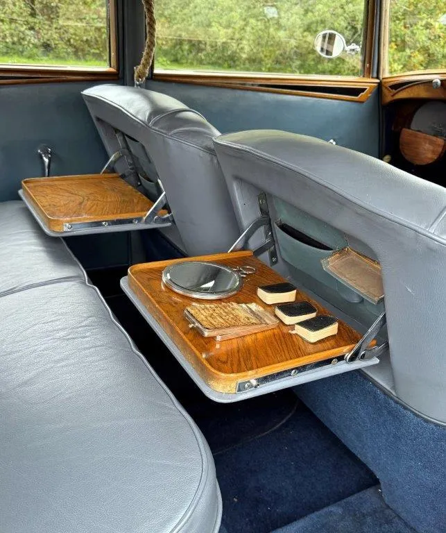 A very stylish, low-slung and sporting design gives this car appeal over and above that of a typical sports saloon. in sound, sharp and smart condition. Low roof line, narrow windscreen & side windows, stylish wings, P100 headlights, PLG40 centre light, scuttle-mounted spot lamp, twin side-mounted spare wheels, polished aluminium Ace wheel discs, ‘trouser crease’ wings, three fitted suitcases (in pale blue leather, as original), and some lovely art deco styling touches, such as attractive, ebony inlays to the door cappings, period door handle design, and piping to seat backrest, all give the car an extra level of desirability. The interior is in very good order, including the relatively recent pale blue leather. The design is particularly sleek and low, as well as being very nicely proportioned, looking good from any angle. Some say that the car has the appearance of a smaller version of a typical Phantom II Continental. You will see in the photos that there is also some interesting, hallmarked silverware, custom fitted in the seat backs, alongside the picnic tables. Gorgeous design, in lovely condition, driving well, and much admired. Since 1995, the car has benefitted from huge expenditure, totalling over £140,000, all documented in the history file, which also includes various other paperwork, as well as an original handbook. The cherry on the cake is that the car is fitted with overdrive, nicely aiding relaxed cruising. We last sold this car four years ago, and it is now available at a figure even more appealing than it was then, and offering tremendous value for money. Chassis No. GNC68 Reg. No. ET 6154