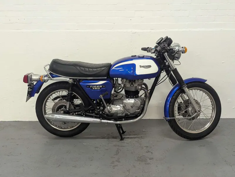 744cc. This blue and white Triumph Tiger 750 motorbike dates from 1979, but was first regi...